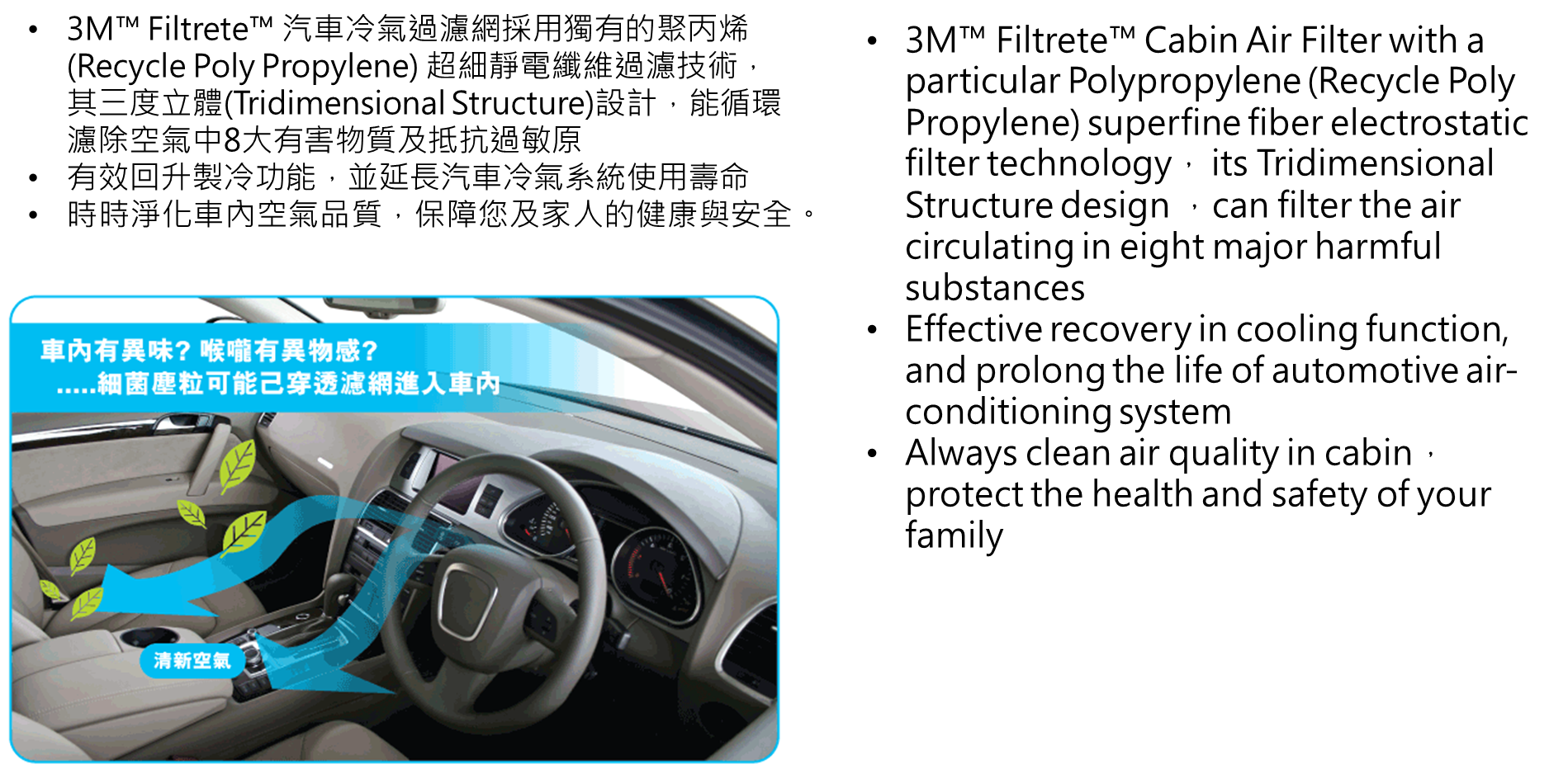 -建議您在正常使用下,每行駛5000 - 10,000公里即應檢查並更換3M汽車冷氣專用過濾網,有效杜絕車內空氣中看不見的呼吸道過敏與疾病傳染源,保障家人健康